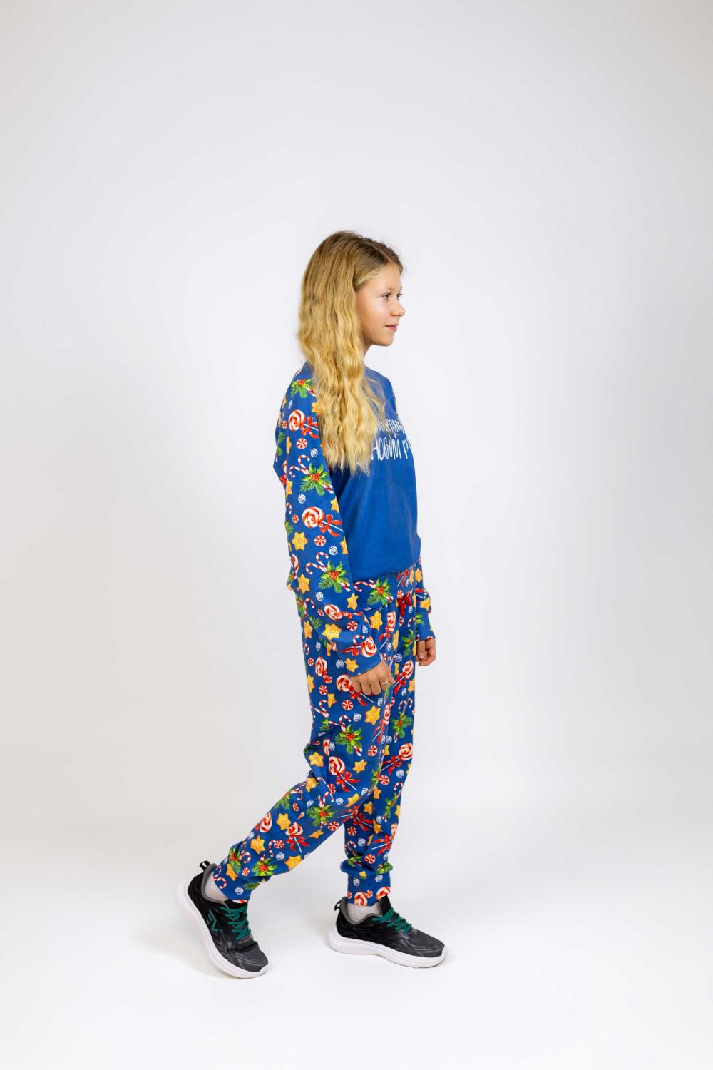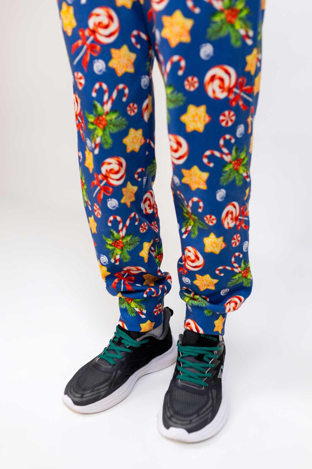Штани на резинці зі шнурком, мають дві глибокі кишені. Яскравий новорічний принт