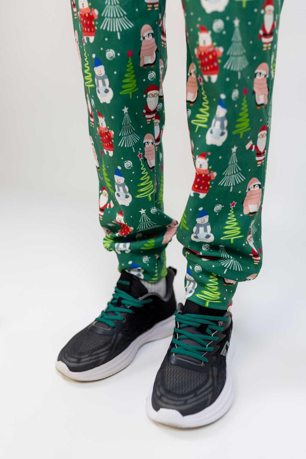 Штани на резинці зі шнурком, мають дві глибокі кишені. Яскравий новорічний принт